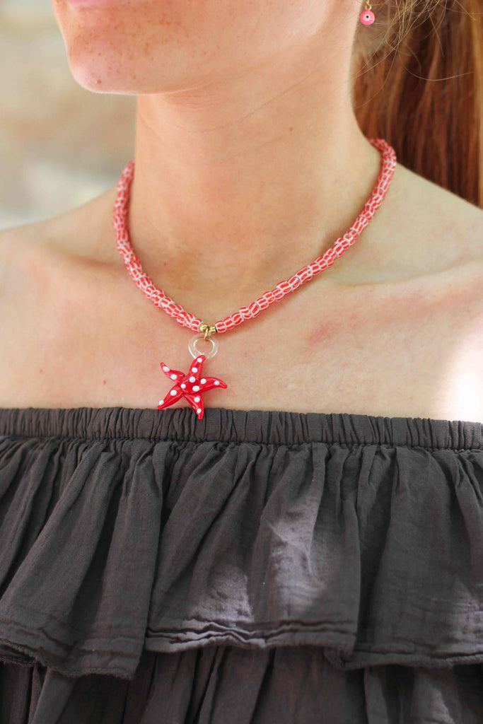 El collar está elaborado con cuentas pequeñas en tono coral entrelazadas a mano, creando un efecto texturizado y alegre. El colgante en forma de estrella de mar, realizado en vidrio rojo con lunares blancos, aporta un toque artístico y juguetón que lo convierte en el accesorio perfecto para looks casuales, playeros o con estilo mediterráneo.