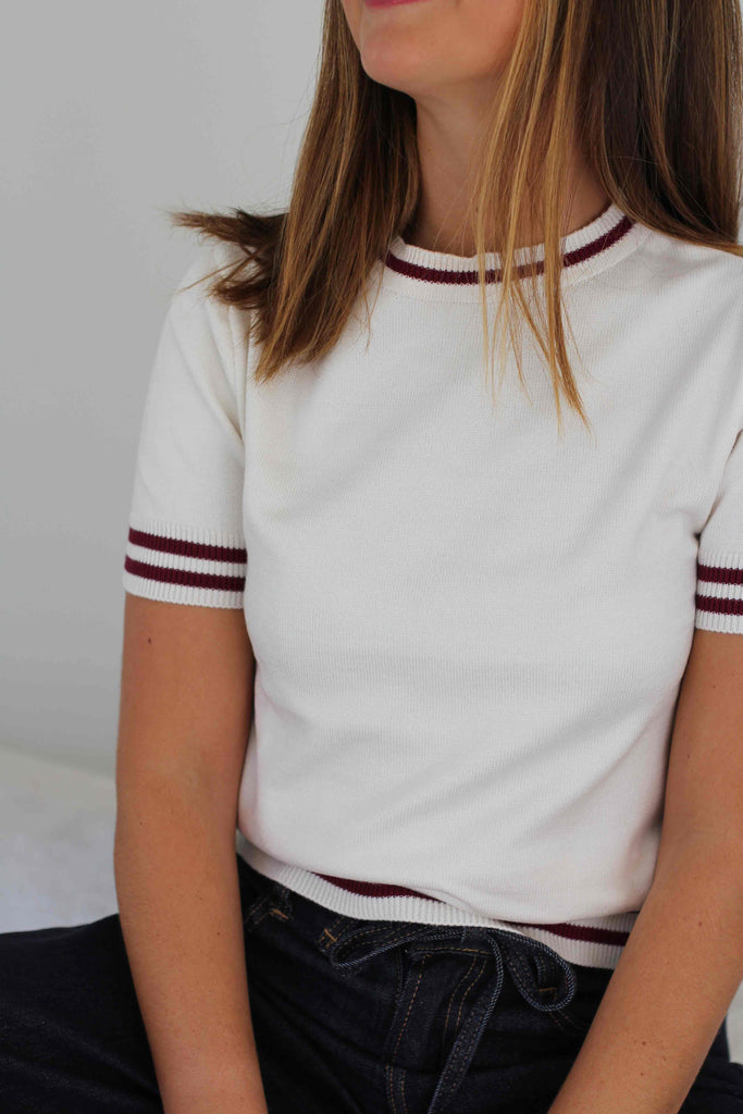 Camiseta de punto fino en blanco, con manga corta y cuello redondo. Detalles de ribetes burdeos en cuello, bajo y mangas que aportan un aire sport y preppy. Corte recto, ligeramente entallado, ideal para combinar con vaqueros o faldas. Suave, cómoda y con un tejido que mantiene la forma. Perfecta para entretiempo y para llevar debajo de chaquetas.