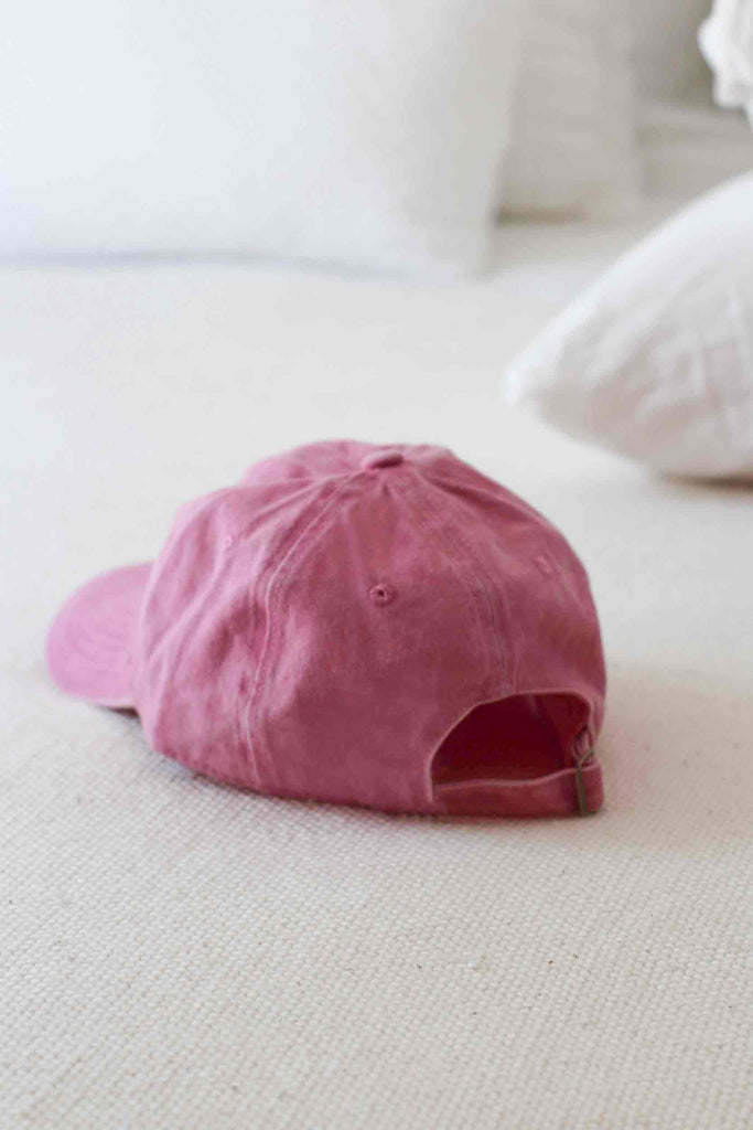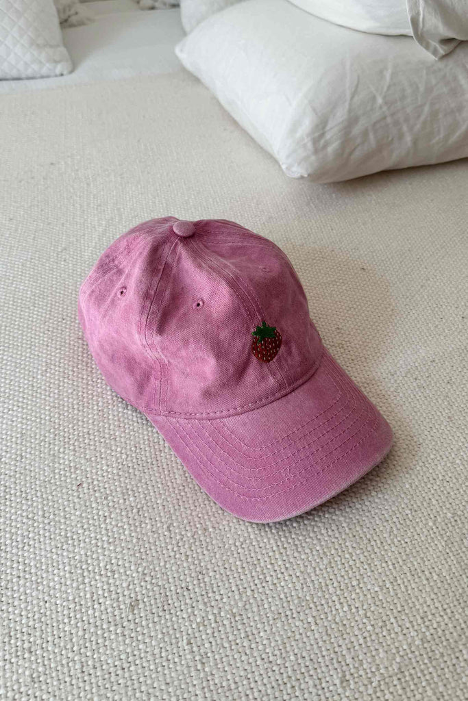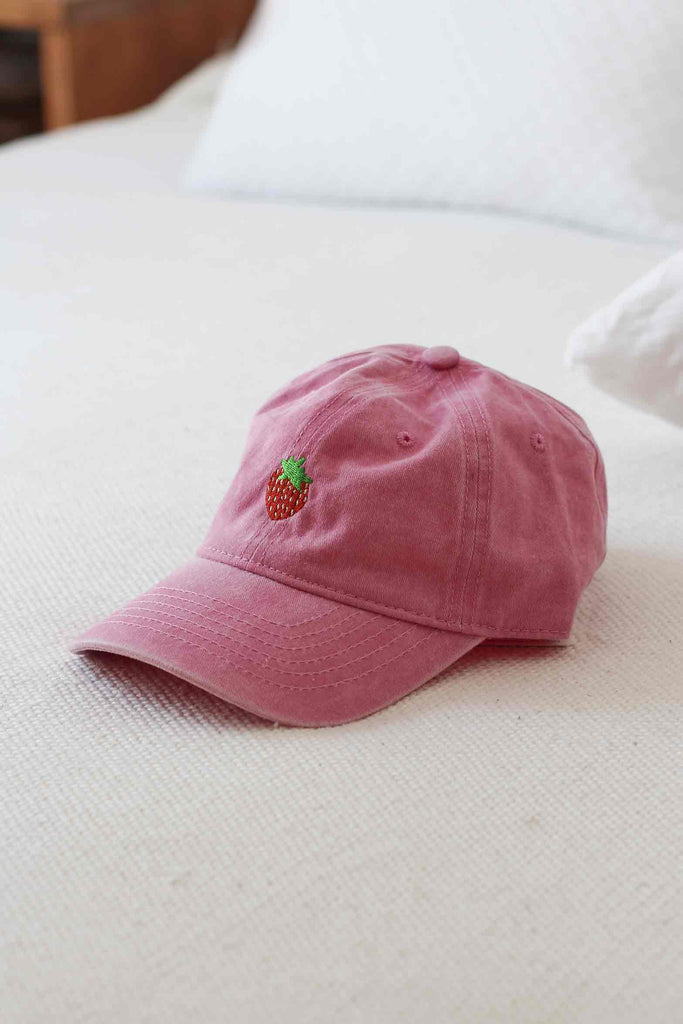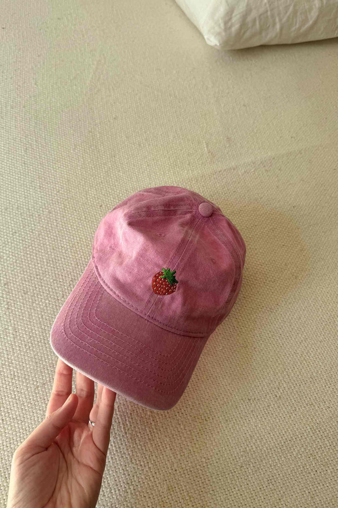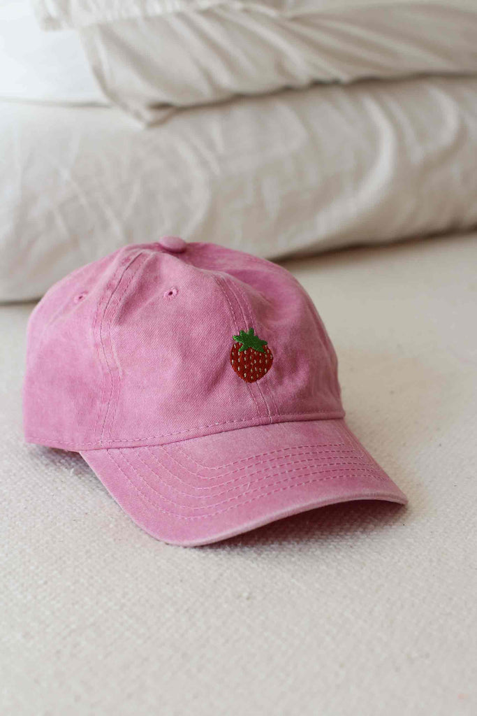 Gorra rosa de algodón lavado es ese toque cute que alegra cualquier look. Lleva un bordado de fresa y un diseño clásico de ala curva con cierre ajustable en la parte trasera.