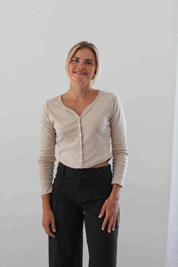 Camiseta básica confeccionada en 100% algodón suave y transpirable. De corte ligeramente ajustado, manga larga y escote pico que realza el cuello sin ser excesivo. Su textura ligera y natural la convierte en una prenda ideal para entretiempo o para usar como primera capa en los meses más fríos. Cierre frontal con pequeños botones a tono (solo en el modelo beige). Disponible en dos colores neutros que combinan con todo: blanco roto y beige claro.
