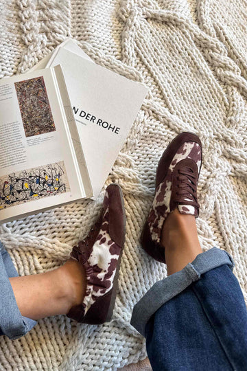 Zapatillas deportivas de mujer con estampado animal print de vaca en tonos marrón y blanco. Un diseño original que combina el toque desenfadado del estampado con la comodidad de una sneaker clásica.