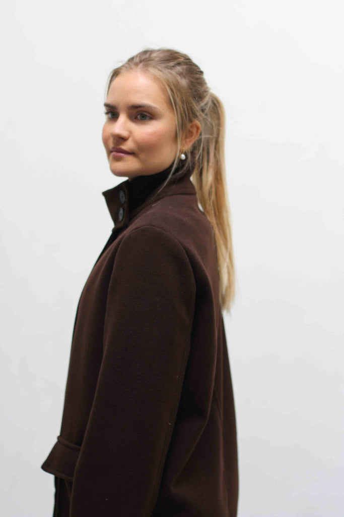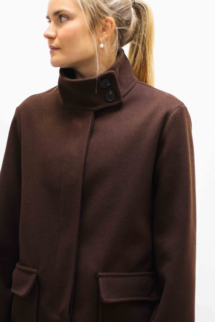 Abrigo hecho en Barcelona, con forro interior, tejido cálido y estructurado. Tiene cuello alto reforzado y cierre con dos botones visibles en la parte superior, que permiten llevarlo completamente subido para mayor abrigo. El cierre frontal está oculto bajo una tapeta limpia que aporta un acabado minimalista y elegante. Dispone de dos bolsillos frontales amplios con solapa, rematados con un pespunte ancho que aporta estructura y funcionalidad. Las mangas rectas ofrecen comodidad y un ajuste natural sin restringir movimiento. El interior está completamente forrado en un forro a tono, suave y confortable, que facilita la puesta y protege el tejido principal. La parte trasera tiene un corte limpio sin aberturas, ideal para mantener el calor y la forma