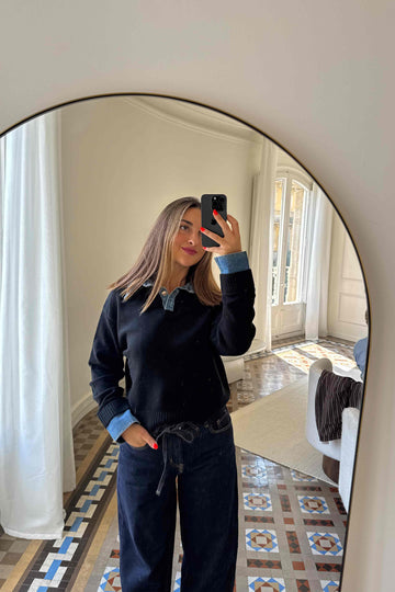 Este jersey azul marino de punto suave destaca por su original diseño con efecto camisa tejana: el cuello y los puños en tejido denim crean un contraste sutil pero muy especial. Tiene un corte ligeramente recto, manga larga y un acabado limpio que combina lo clásico con un toque casual. Ideal para esos días en los que quieres ir cómoda pero con algo distinto.