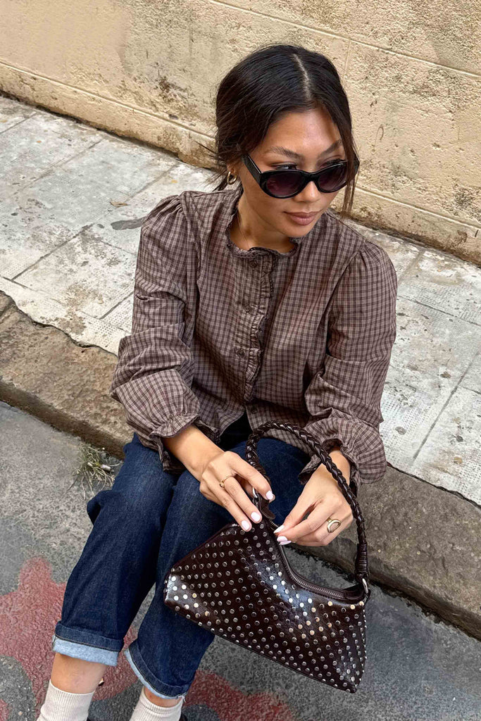 Un bolso versátil con aire retro, ideal para combinar con camisas de cuadros o looks más sobrios.