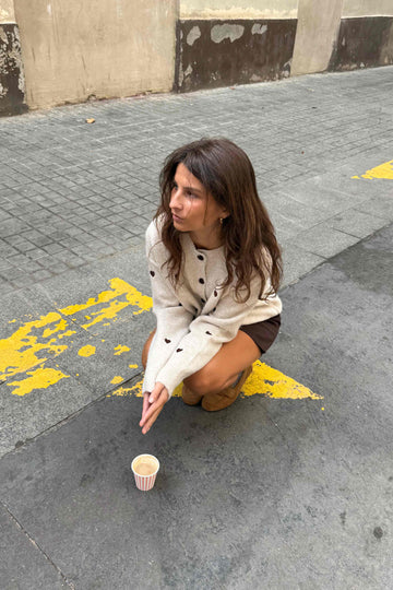 Jersey de punto con un aire romántico. Confeccionado en un tejido suave y cálido, con corazones bordados en contraste repartidos por todo el cuerpo y las mangas. Los botones, también en forma de corazón. Disponible en marrón chocolate, burdeos y beige, dos tonos versátiles y fáciles de combinar. Su corte recto y ligeramente suelto lo hace cómodo y favorecedor, perfecto tanto para el día a día con vaqueros como para combinar con faldas o pantalones más arreglados.