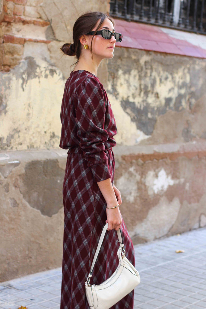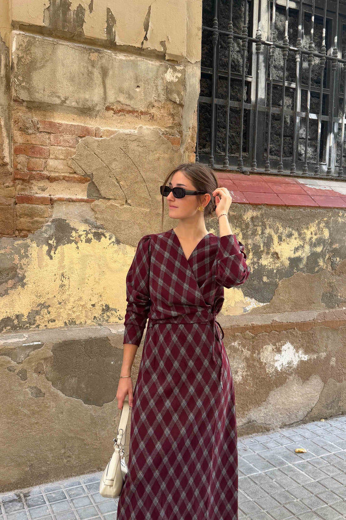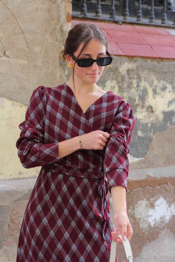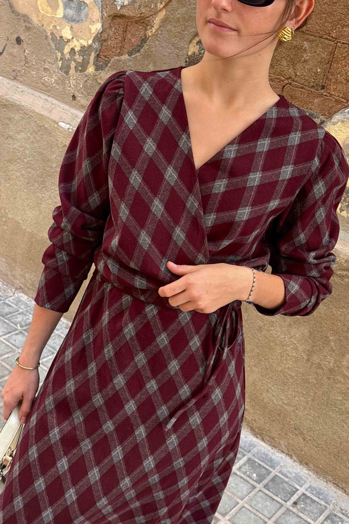 Cárdigan cruzado confeccionado en tejido de cuadros en tonos burdeos y gris, con un diseño envolvente que se ajusta mediante lazada lateral.