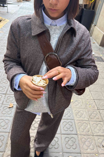 El tejido de espiga le da una textura sutil y elegante, perfecta para el día a día. Confeccionada en talleres locales de Barcelona, combina un corte clásico con un aire actual.