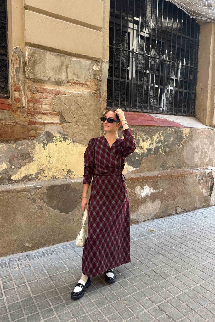 Falda larga confeccionada en tejido de cuadros burdeos y gris, con cinturilla alta que define la silueta y aporta un ajuste cómodo.