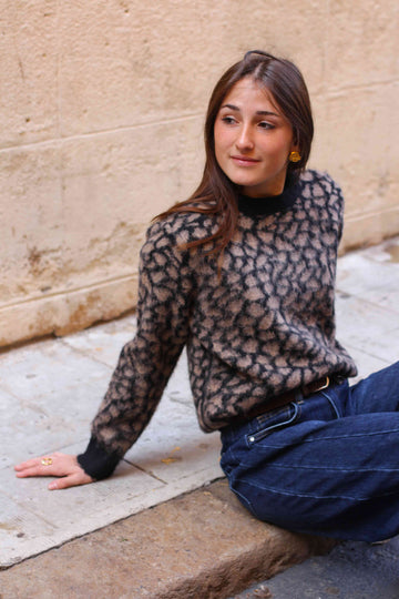 Jersey de punto suave con estampado en tonos marrón y negro. Diseño de cuello redondo, manga larga y acabados en rib.