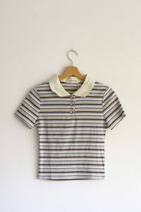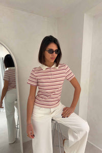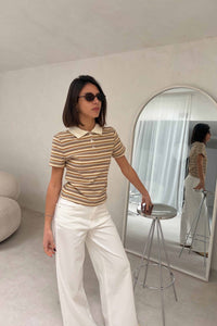 Polo confeccionado en tejido de algodón con ligera elasticidad. Estampado de rayas horizontales en tonos ocre y blancos. Tiene cuello camisero en color crudo. Manga corta y un corte ajustado que se adapta al cuerpo. La modelo lleva la talla S/M